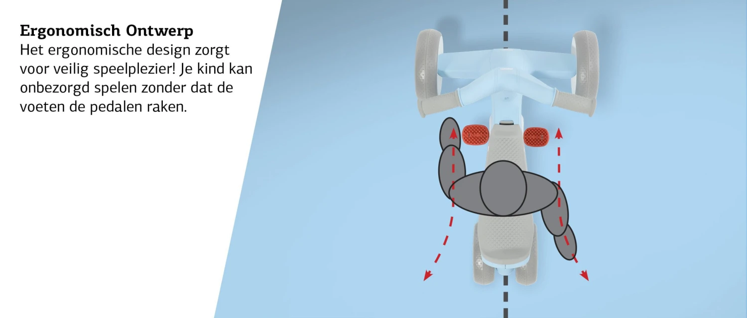 • Ergonomisch design zorgt voor veilig speelplezier. Je kind kan onbezorgd spelen zonder dat de voeten de pedalen raken.