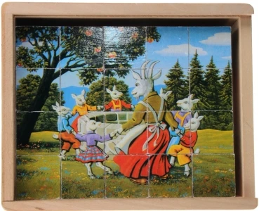 Blokpuzzel bestaande uit 20 blokken in houten kistje met schuifdeksel. Met de blokken kunnen 6 afbeeldingen uit bekende sprookjes worden gemaakt. Inclusief voorbeeldbladen.
