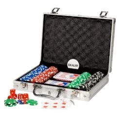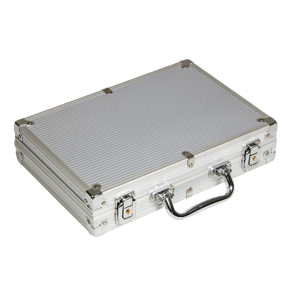 Luxe afsluitbare aluminium pokerkoffer met 200 fiches van professionele kwaliteit, 2 spellen kaarten, 5 dobbelstenen en dealer button.