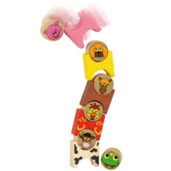 De ronde blokjes met de kopjes van bekende dieren kunnen geplaatst worden op de vierkante blokken met halfronde uitsparingen. Het stimuleert de motoriek en de oog-hand coordinatie.