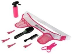 Speciaal voor de kleine kappers. Complete kappersgordel met toebehoren (Braun Satin Hair 7 borstel, kam, schaar, spuit en haarspeldjes). De batterij voor de borstel is niet inbegrepen.