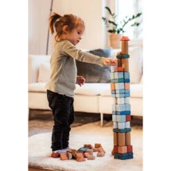 De speelblokken hebben afgeronde hoeken en een natuurlijk ruw oppervlak waardoor de stenen fijn aanvoelen en meer grip hebben. Ze stapelen dus eenvoudiger.