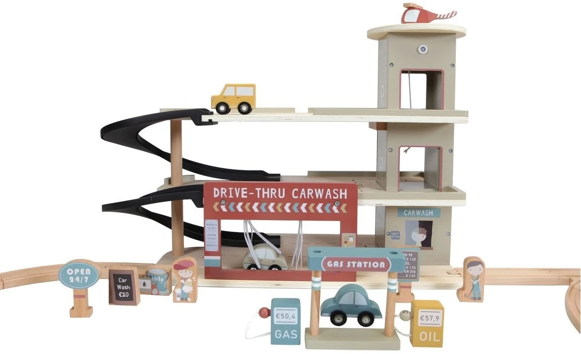 Stop bij de garage om benzine te tanken, je auto te parkeren of laat ‘m schoonmaken in de wasstraat. De uitbreiding bevat een garage met carwash, auto’s, helikopter, benzinestation, pompen, borden en medewerkers. De houten garage is één van de vele speelsets die gekoppeld kan worden aan de treinset XXL van Little Dutch. Op de garage vind je een helikopterplatform en de houten figuren zijn aan beide kanten voorzien van een gedetailleerde illustratie. Je maakt de garage helemaal af met de treinset XXL en de uitbreidingssets voor uren speelplezier.