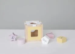 Vrolijke houten vormenstoof van Little Dutch met illustraties van dierentuindieren. Door de verschillende openingen in de kubus kunnen de vormen naar binnen worden geduwd. Deze vormenstoof stimuleert de oog-handcoördinatie en leert je kindje vormen herkennen.