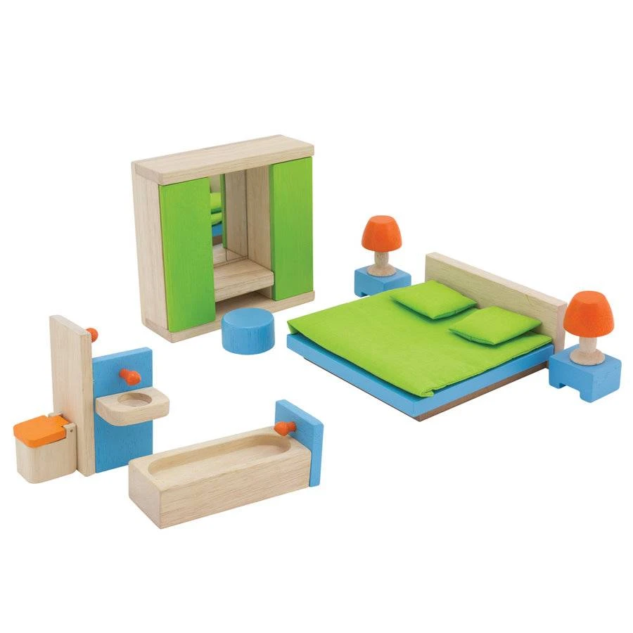 Complete slaapkamer-inrichting en badkamer voor poppenhuis. Geschikt voor alle huizen onder de categorie Poppenhuizen op deze site.Â